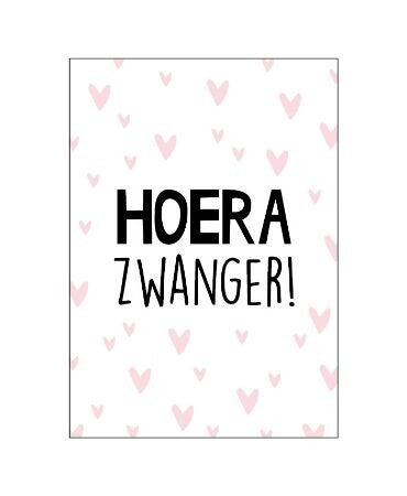 Ansichtkaart met de tekst: Hoera zwanger! Afmeting: 10,5 x 14,8 cm (A6 formaat) Gemaakt van helder wit karton. De achterkant heeft aan de rechterkant stippellijntjes voor het adres, de linkerkant is blanco dus alle ruimte voor een persoonlijke boodschap!