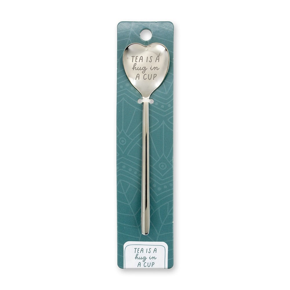 Theelepeltje in de vorm van een hartje. In het hartje staat de tekst 'Tea is a hug in a cup' gegraveerd. Past perfect bij de leuke theemokken met de heerlijke thee van Arelo!