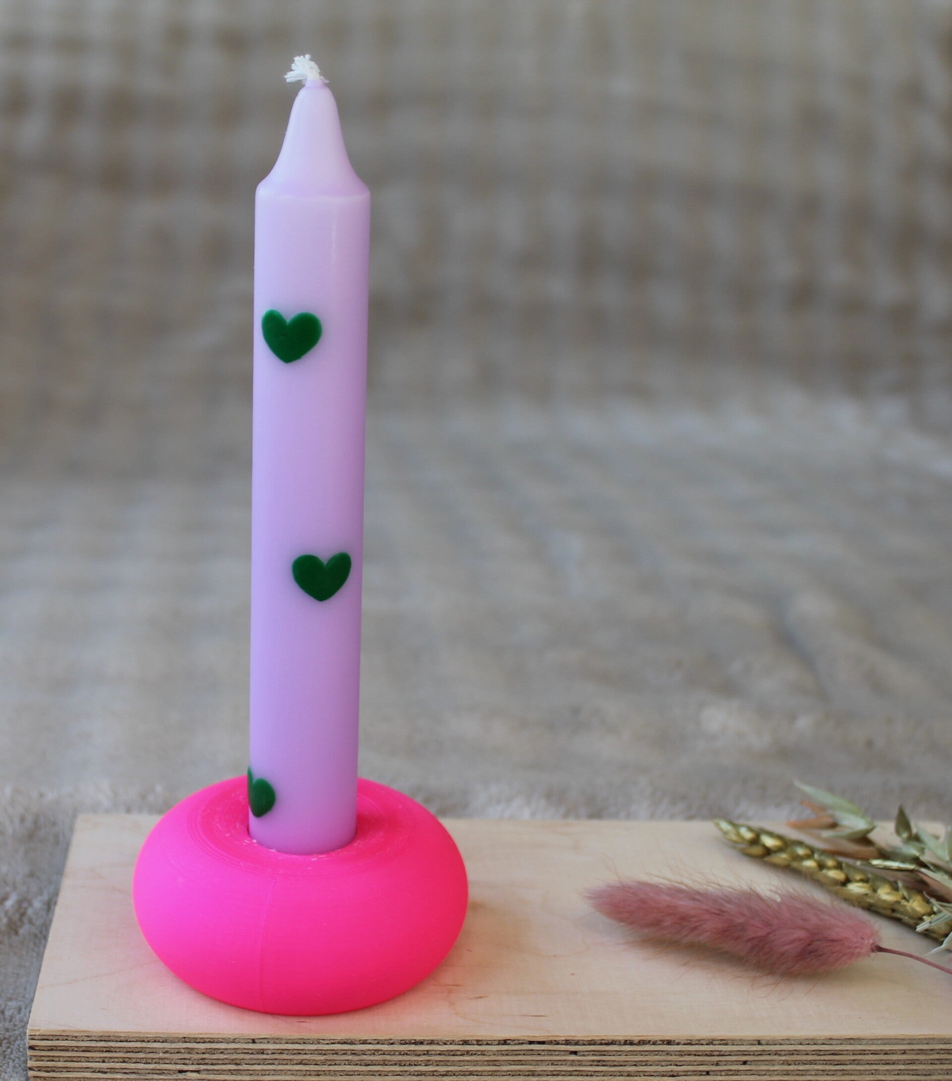 Breng kleur en gezelligheid in huis met deze lieve handgedecoreerde dinerkaars. Deze paarse kaars is versierd met kleine groene hartjes. Een uniek cadeau of sfeervolle decoratie voor elk interieur.
