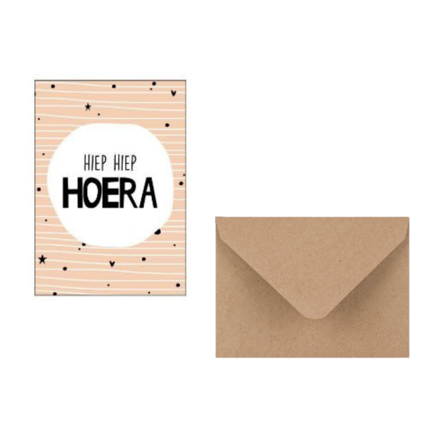 Cadeaukaart met de tekst: Hiep Hiep HoeraAfmeting: 7,4 x 10,5 cmGemaakt van hoogwaardig 400 grams papier.De achterkant is blanco, dus alle ruimte voor een persoonlijke boodschap!
