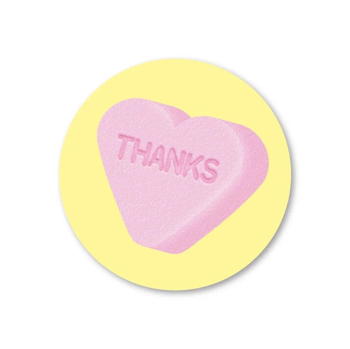 Ronde sticker met snoephartje met de tekst 'thanks'.