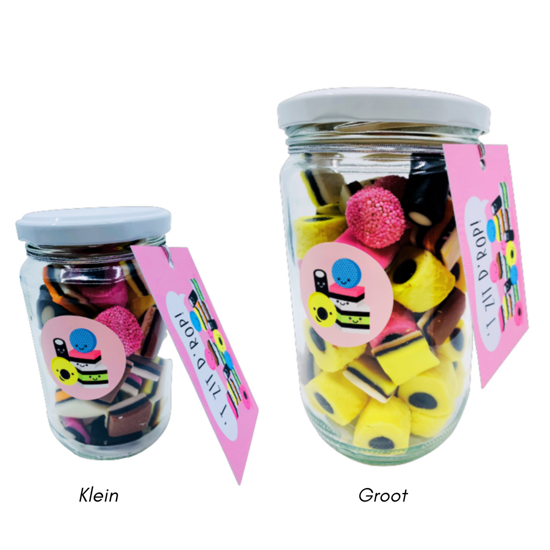 De snoeppot is voorzien van een vrolijk cadeaulabel waarop dropjes zijn afgebeeld en waarop de tekst ’t zit D’ROP!’ staat.