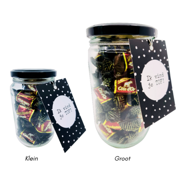 De snoeppot is voorzien van een zwart/wit cadeaulabel met de tekst ‘Ik vind je tof!’