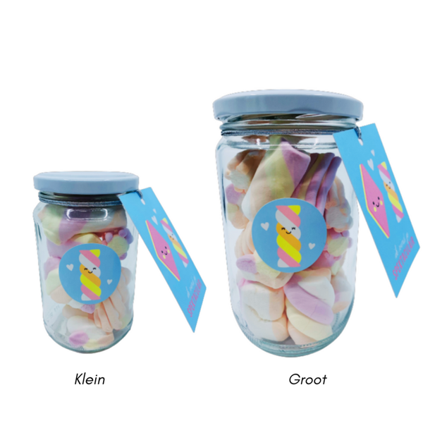 De snoeppot is voorzien van een gekleurd cadeaulabel met spekjes en de tekst