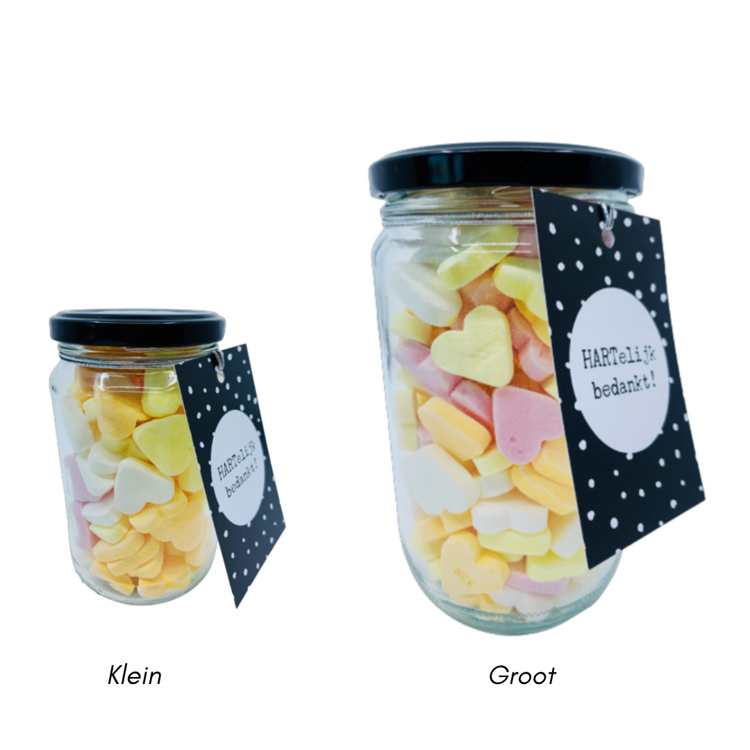 De snoeppot is voorzien van een zwart/wit cadeaulabel met de tekst ‘HARTelijk bedankt!’